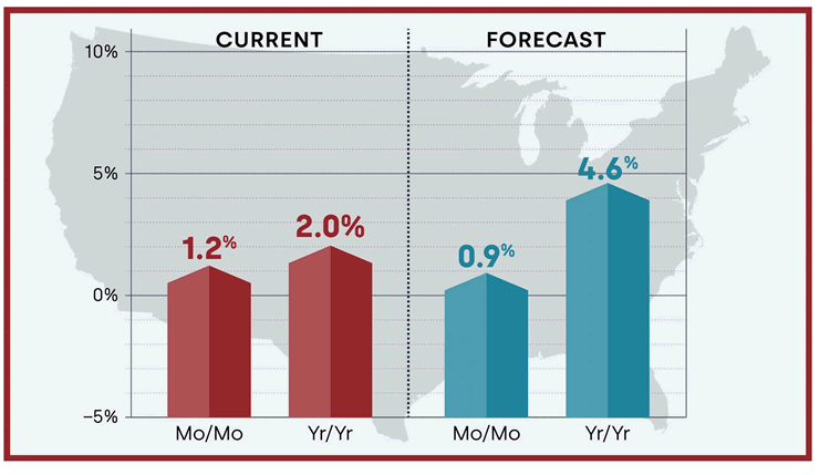 The CoreLogic HPI Forecast indicates that home prices will increase on a month-over-month basis by 0.9% from April 2023 to May 2023 and increase on a year-over-year basis by 4.6% from April 2023 to April 2024.