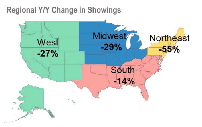 All four regions in the United States saw a decrease in showings year-on-year, with the Northwest falling by 55 percent, Midwest by 29 percent, West by 27 percent, and the South by 14 percent.