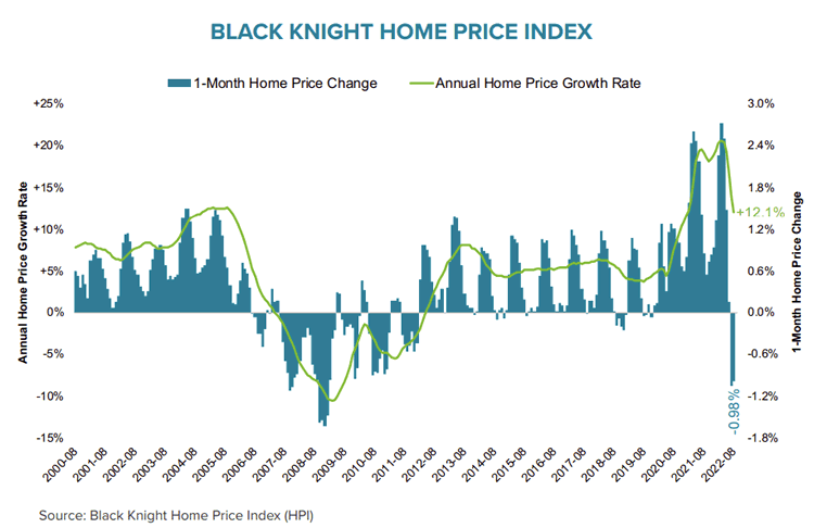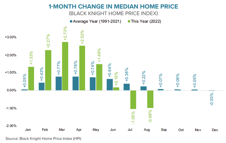 - According to the Black Knight HPI, median home prices fell 0.98% in August, only marginally better than July's upwardly revised 1.05% monthly decline