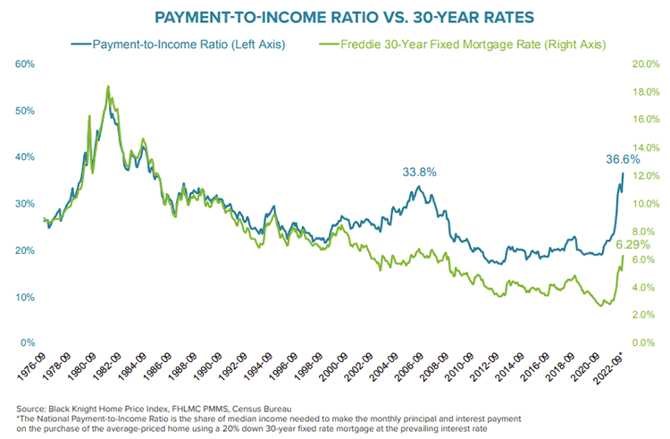 - As of Sept. 22, with interest rates at 6.29%, it required 36.6% of the median household income to make the principal and interest payment on the average home purchase, the largest share since May 1985