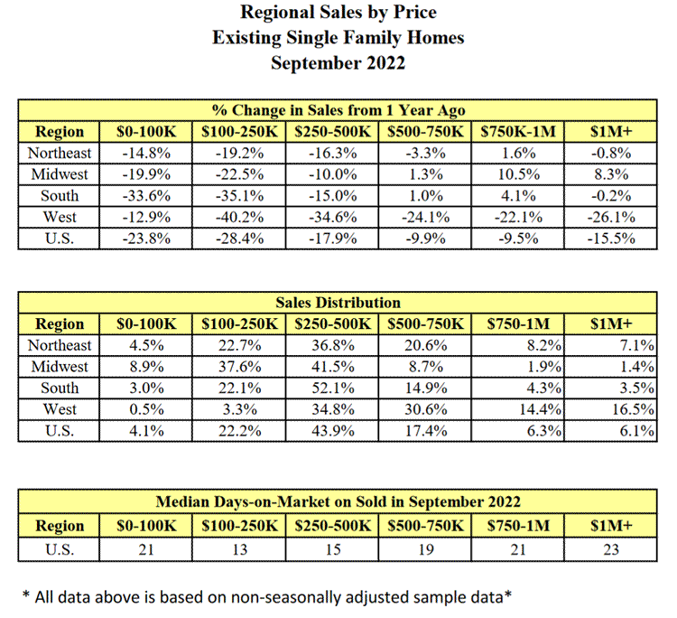 In the South, existing-home sales pulled back 1.9% in September from August to an annual rate of 2,080,000, a decline of 23.8% from this time last year. The median price in the South was $351,700, an increase of 11.8% from September 2021.