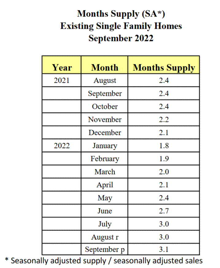 Total housing inventory registered at the end of September was 1.25 million units, which was down 2.3% from August and 0.8% from the previous year. Unsold inventory sits at a 3.2-month supply at the current sales pace – unchanged from August and up from 2.4 months in September 2021.