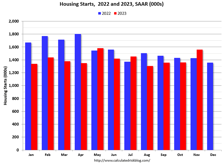 Privately‐owned housing starts in November were at a seasonally adjusted annual rate of 1,560,000. This is 14.8