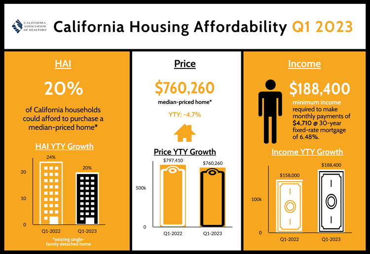 - Twenty percent of California households could afford to purchase the $760,260 median-priced home in the first quarter of 2023, up from 17 percent in fourth-quarter 2022 and down from 24 percent in first-quarter 2022.